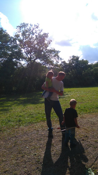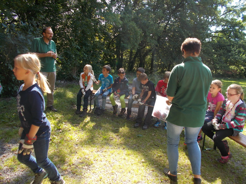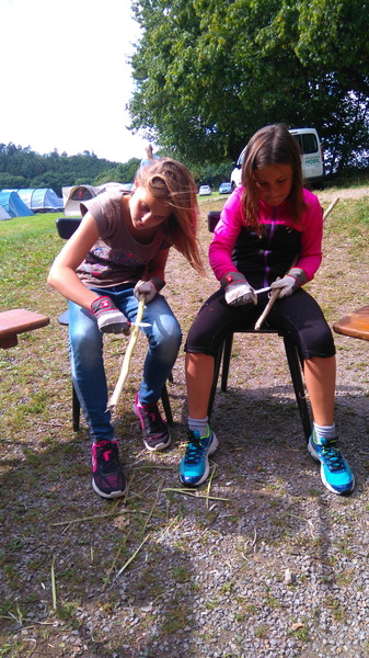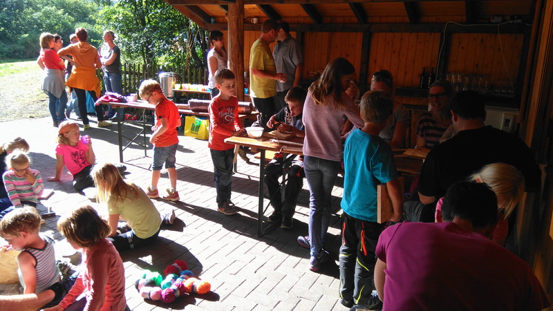 Nachdem die erste Hürde genommen war luden die recht milden, sommerlichen Temperaturen nun zum Quatschen, entspannen und zu Kaffee und Kuchen ein. Ab halb vier sollte damit jedoch erst einmal Schluss sein- zumindest für die Kinder. Jetzt hieß es: ran an die Arbeit! Angeleitet durch Gerda und Ulrich Hering vom Naturschutzzentrum Arche Noah aus Menden, konnten sich die Kids ab etwa 6 Jahren voll und ganz beim Schnitzen verausgaben. Alle interessierten Kinder durften sich mit Taschen-/ oder Schnitzmesser aus Ästen einen Pfeil und einen Bogen schnitzen. Schnell waren über 30 Kinder aktiv und konzentriert am Werkeln. Die kreativen Ergebnisse konnten sich durchaus sehen lassen. Einige Bögen wurden sogar mit Namen und Mustern verziert. Toll!