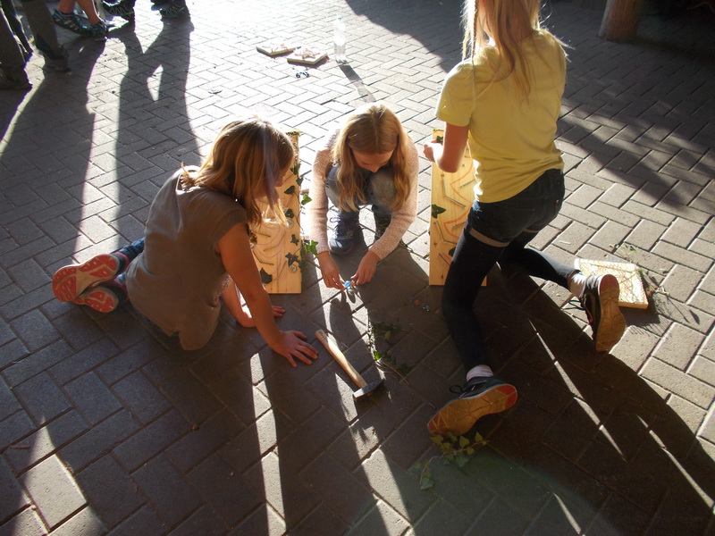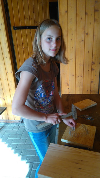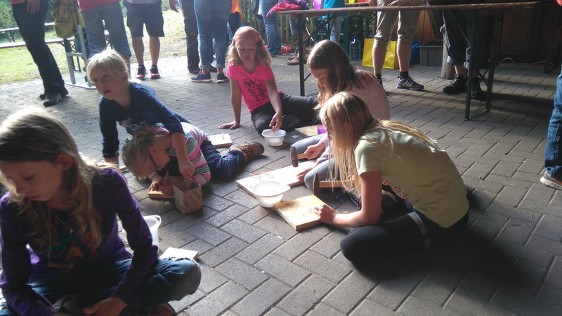 Für die jüngeren Kinder und einige Erwachsene stand alternativ eine klassische Mini Olympiade auf dem Programm. Unter anderem in den Disziplinen Sackhüpfen, Stelzen laufen und Seil springen machten die kleinen eine sehr gute Figur. Und die Erwachsenen…?? …hatten zumindest Spaß! Nach dem offiziellen Programm gab es nun nochmal ordentlich „Krach unterm Dach!“ Alle interessierten und immer noch arbeitswütigen Kinder durften sich an einem Nagelbrett versuchen. Jeder hatte die Möglichkeit ein Muster auf eine kleine Holzplatte aufzumalen und die Linien dann mit Nägeln zu beschlagen. Anschließend konnten die Nägel mit Gummibändern oder Wolle bespannt werden. Heraus kamen kunstvolle Bilder mit z.B. Sternen, Mustern, Herzen oder Traktoren. Sogar Kugelbahnen wurden gebaut und im Anschluss direkt bespielt. Das Hämmern unter dem Abdach der Biberhütte war beachtlich und die Geräuschkulisse enorm. Was blieb den Eltern übrig? Quatschen war fast nicht mehr möglich, also war die Devise: Helfen und fix fertig werden!!!