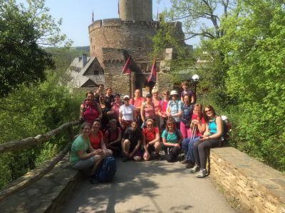 Als Termin wurde von Wanderführerin Renate Kegel das Wochenende von Freitag, den 20.04. – Sonntag, den 22.04.2018 auserkoren. Angestrebtes Ziel: Brodenbach an der Mosel. Zwei Traumpfade sollten erwandert werden, der Bergschluchtenpfad/Ehrenburg (18,6 km, 879 Höhenmeter, 6 Stunden Wanderzeit) und der Hatzenporter Laysteig (13 km, 257 Höhenmeter, 4 Stunden Wanderzeit). Auch nach Kenntnisnahme der Wanderinformationen mit Streckenlängen und Höhenmetern waren 21 Damen sicher, sich für die Tour anmelden zu wollen. Natürlich nicht ohne den Hoffnungsschimmer im Hinterkopf, dass Regenschirme und Regenjacken im Koffer würden verbleiben können.