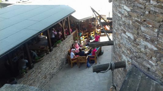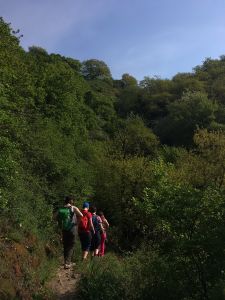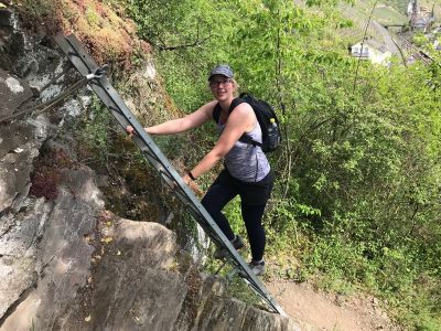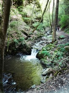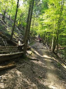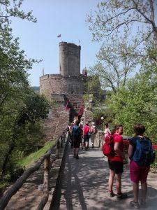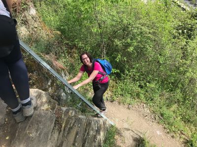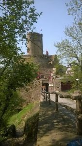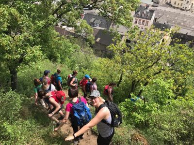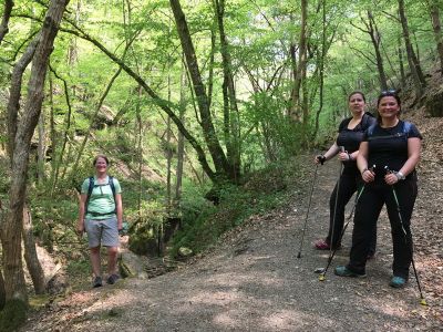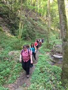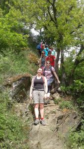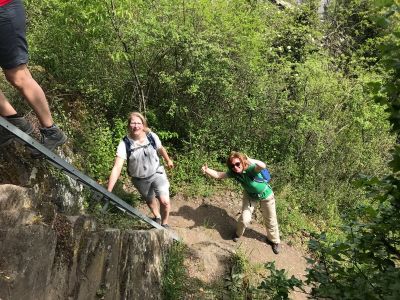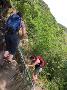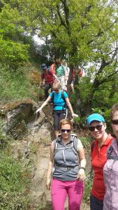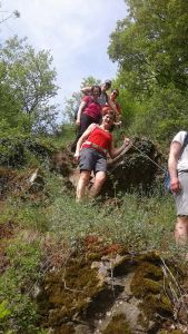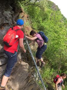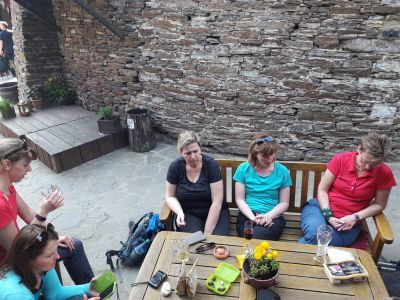 Am Samstag führte die Wanderung über den Bergschluchtenpfad. Dieser wird auf der Seite Traumpfade.info im Internet folgendermaßen beschrieben: “Die ursprüngliche Natur, die steilen Felsen und geheimnissvollen Höhlen sowie das Donnerloch mit seinem Wechselspiel von Fels und gurgelndem Wasser ziehen den Wanderer in ihren Bann.” Genauso war es. Allerdings nicht, ohne der Kondition streckenweise auch einiges abzuverlangen, denn es gab auf dem Pfad steile Anstiege zu bewältigen. Eine längere Pause auf dem Gelände der renovierten mittelalterlichen Ehrenburg (natürlich mit Sitzplatz und kühlem Getränk) tat zwischendurch allen gut, bevor es wieder Richtung Brodenbach ging. Der Rundweg konnte vor Brodenbach zum Glück noch abgekürzt werden, so dass sich einige Wanderinnen den letzten steilen Anstieg sparen konnten.