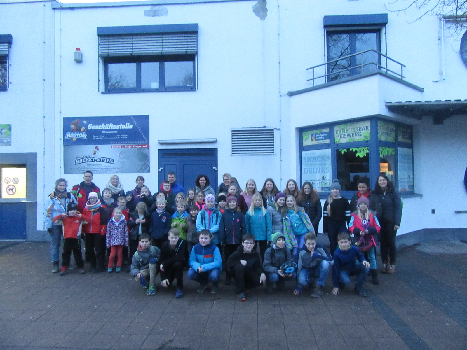 Mit dem Bus ging es sicher und komfortabel nach Iserlohn. Dank der super Organisation von Renate Kegel konnten wir alle direkt in die Halle gehen, unsere Schlittschuhe in Empfang nehmen und uns umziehen. Mit untergeschnürten Schlittschuhen ging es dann in die Halle. Dort konnten wir noch dem Nachwuchs beim Hockey-Training zusehen.
