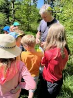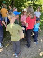 Frisch gestärkt ging es an die nächste Aufgabe. In Zweier- bzw. Dreiergruppen sollten die Kids auf dem weiteren Weg in Richtung Schröders Bank jeweils ein Teil aus dem Wald in eine Papiertüte sammeln, das die anderen Kinder dann an der Bank ertasten sollten. Neben Moos, Blättern und Zapfen gab es tatsächlich auch noch weitere Knochen zu ertasten.
