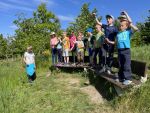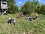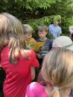 Auf einem „Geheimweg“ sollten die Kids 5 verschiedene Bäume zeigen und benennen. Aber auch diese Aufgabe wurde locker bewältigt. Der Weg mündete auf einer kleinen Lichtung. Am dortigen Hochsitz war auch die erste Verpflegungsstation mit Wasser, Capri-Sonne, Gummibärchen und Keksen.
