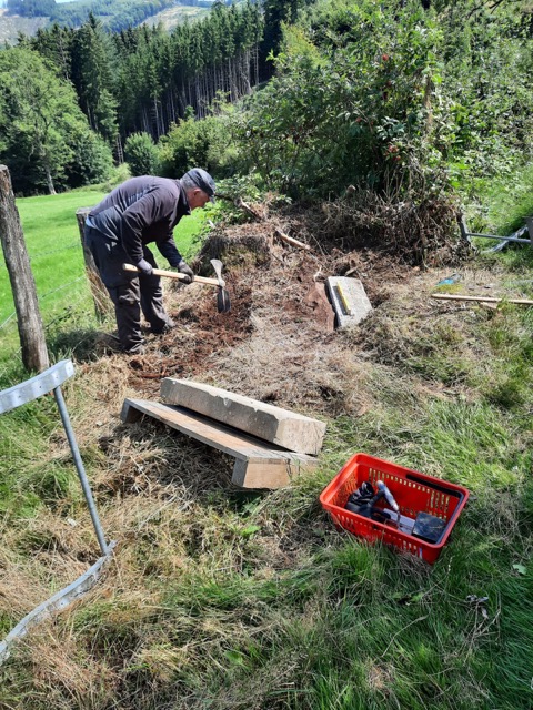 Am 09.08.2025 wurde der Bereich von Sträuchern befreit und der Unterbau sorgfältig vorbereitet. Zwei Tage später stellte eine kleine, bewährte Arbeitstruppe unter der Führung des ehemaligen Vorsitzenden – vielleicht sein letztes offenes Projekt? – die Unterkonstruktion auf und verschraubte sie mit neuen Brettern.