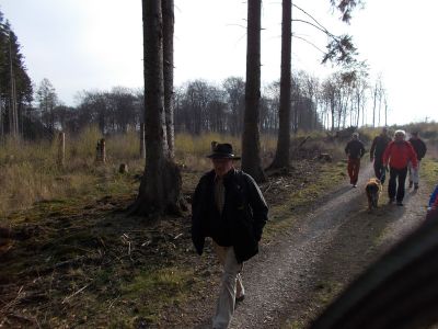 Über die Ruhrbrücke geht es, die Bahnschienen querend bis zur Röhr der wir kurz folgen. Mit Blick auf Schloß Herdrigen geht es langsam bergauf Richtung Teufelskopf, den wir rechts liegen lassen, um den Anstieg zum Müssenberg unter die Füße zu nehmen, eine „echte Bergwertung“. Der Abstieg nach Hachen läßt uns auf die „Kurzstreckler“ treffen. Von gestarteten 9 Wanderern steigen zwei Damen aus, dafür kommen 6 Erwachsenen und 3 Kinder hinzu, unser jüngstes Nachwuchswanderkind mit eineinhalb Jahren in der Kiepe von Mama und Papa abwechselnd getragen, das ist Nachwuchsarbeit.