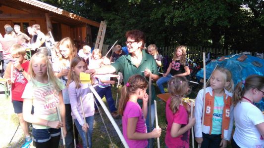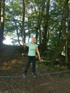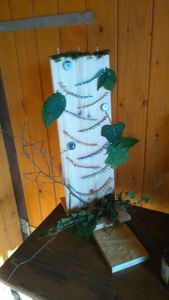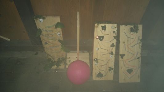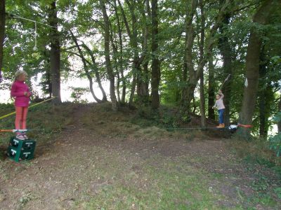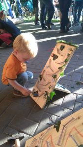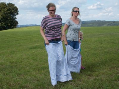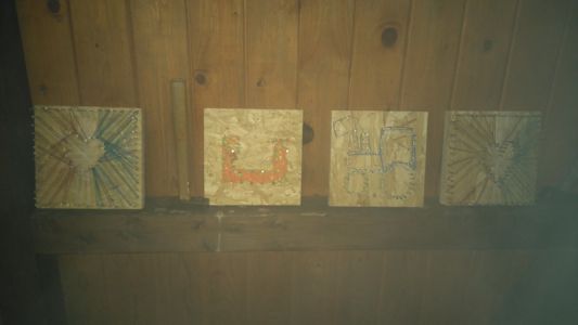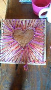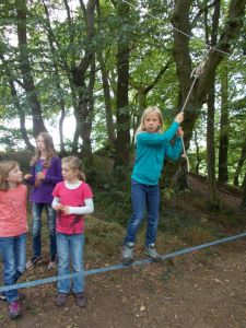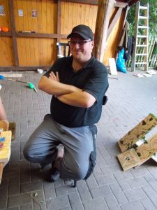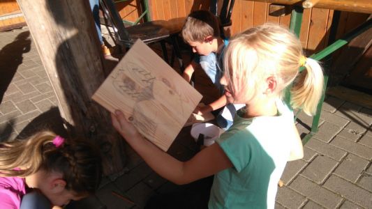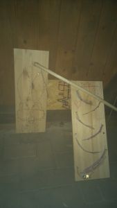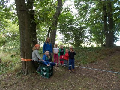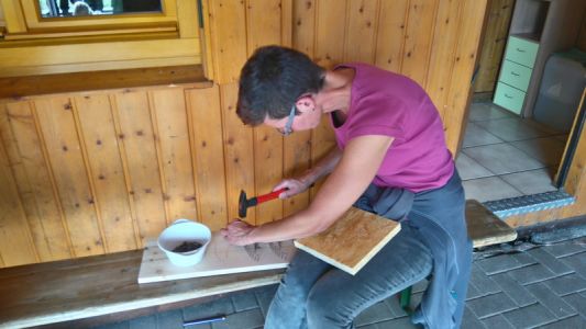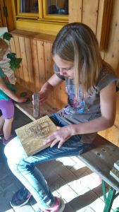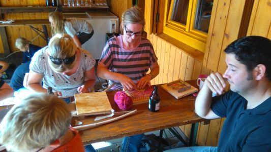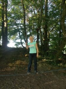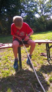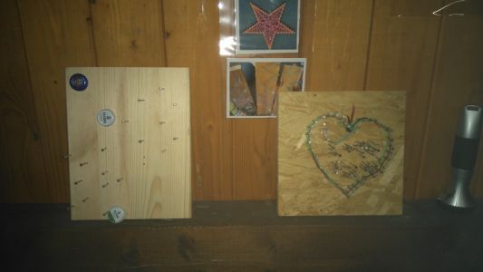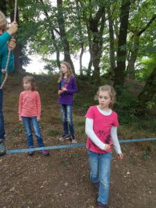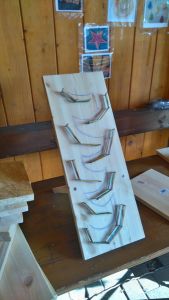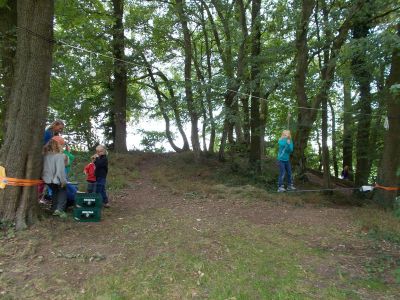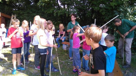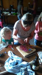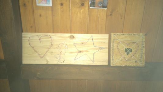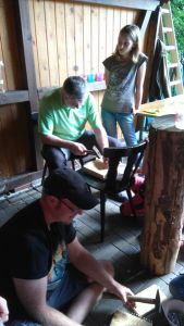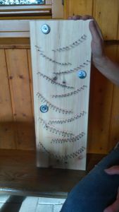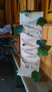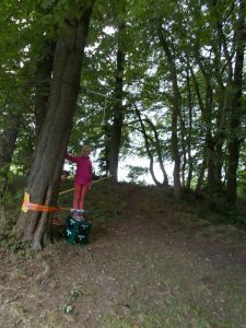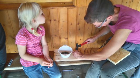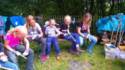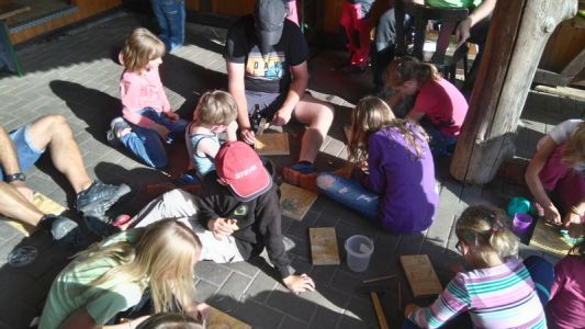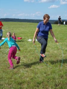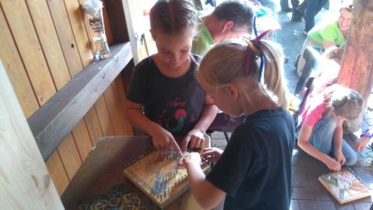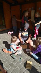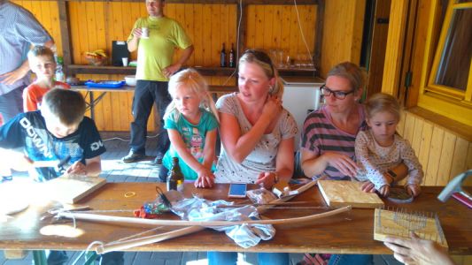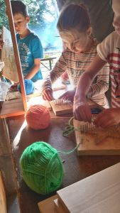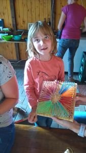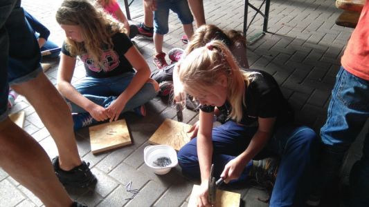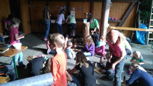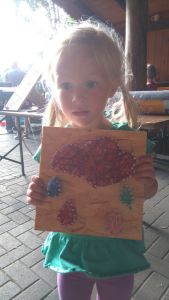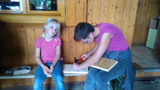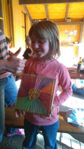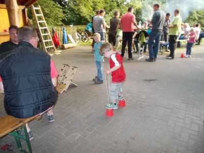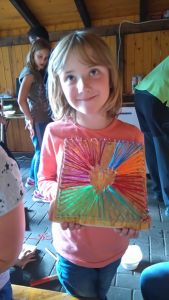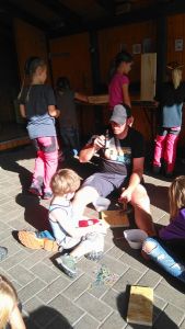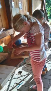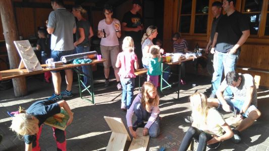 Für die jüngeren Kinder und einige Erwachsene stand alternativ eine klassische Mini Olympiade auf dem Programm. Unter anderem in den Disziplinen Sackhüpfen, Stelzen laufen und Seil springen machten die kleinen eine sehr gute Figur. Und die Erwachsenen…?? …hatten zumindest Spaß! Nach dem offiziellen Programm gab es nun nochmal ordentlich „Krach unterm Dach!“ Alle interessierten und immer noch arbeitswütigen Kinder durften sich an einem Nagelbrett versuchen. Jeder hatte die Möglichkeit ein Muster auf eine kleine Holzplatte aufzumalen und die Linien dann mit Nägeln zu beschlagen. Anschließend konnten die Nägel mit Gummibändern oder Wolle bespannt werden. Heraus kamen kunstvolle Bilder mit z.B. Sternen, Mustern, Herzen oder Traktoren. Sogar Kugelbahnen wurden gebaut und im Anschluss direkt bespielt. Das Hämmern unter dem Abdach der Biberhütte war beachtlich und die Geräuschkulisse enorm. Was blieb den Eltern übrig? Quatschen war fast nicht mehr möglich, also war die Devise: Helfen und fix fertig werden!!!