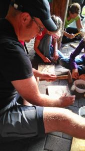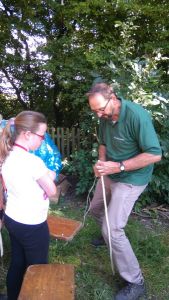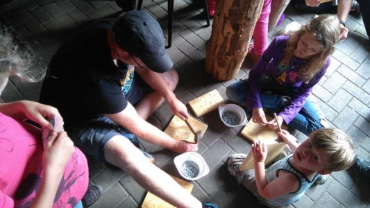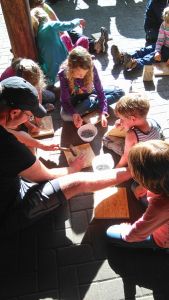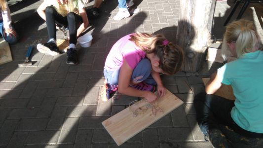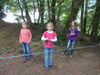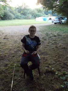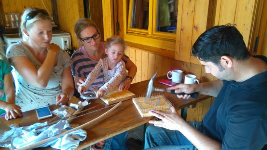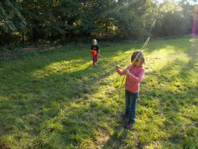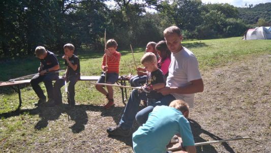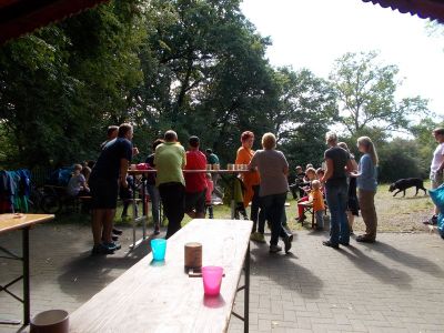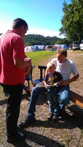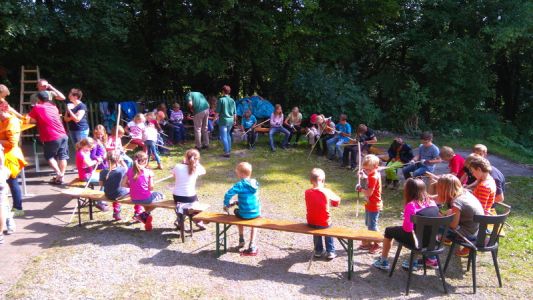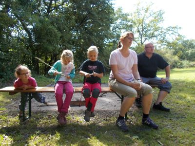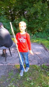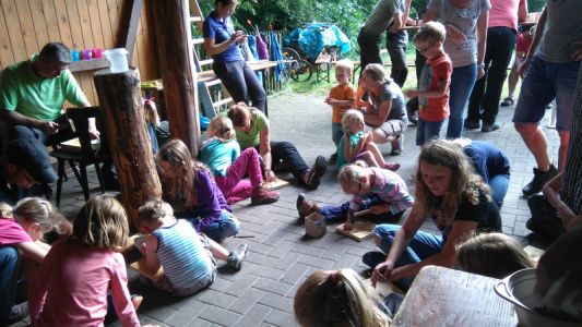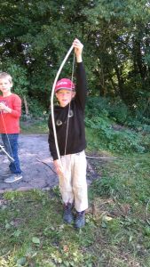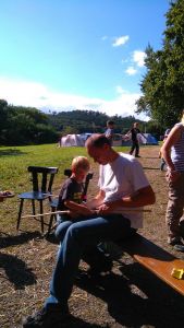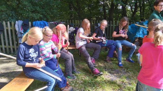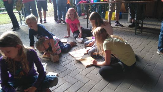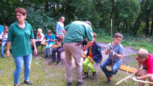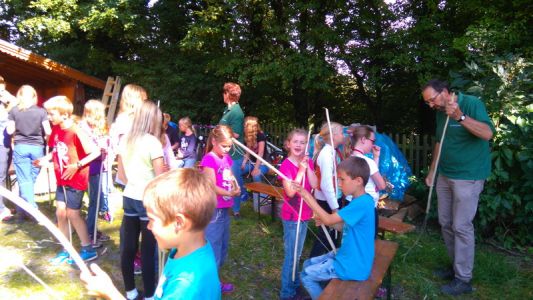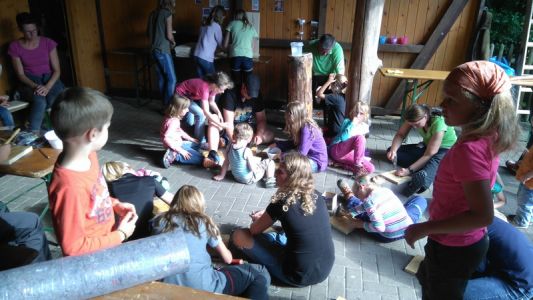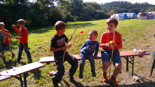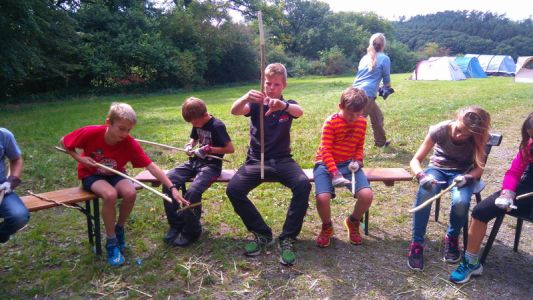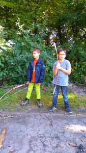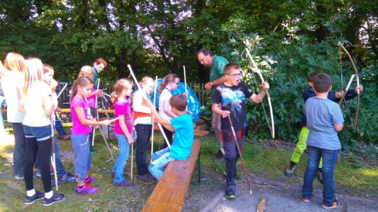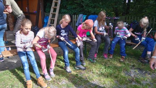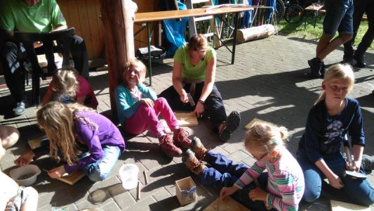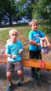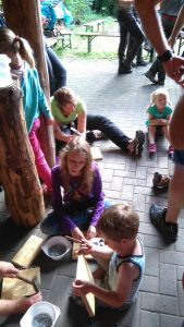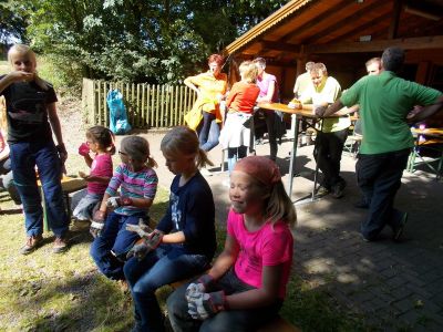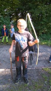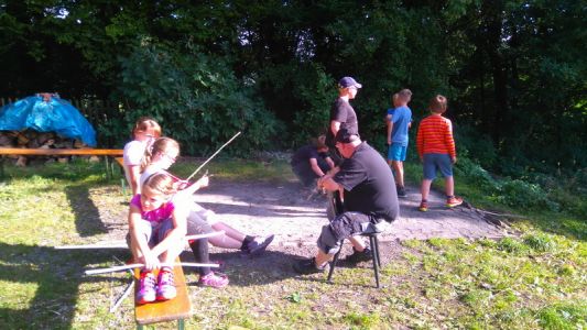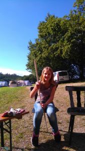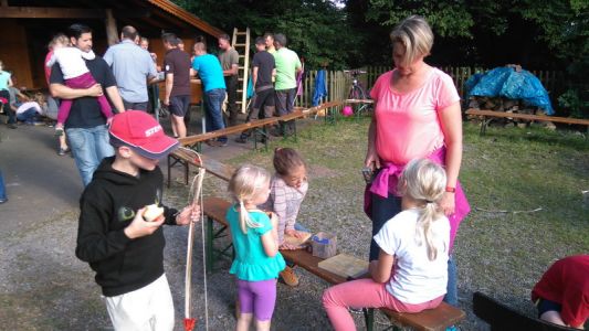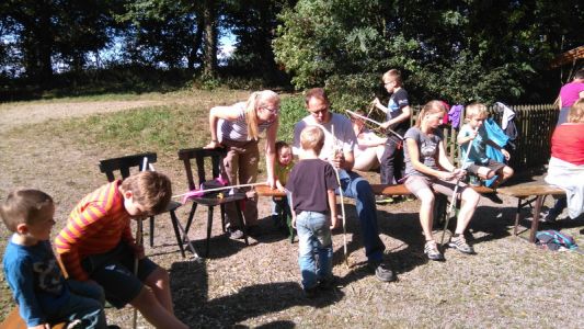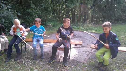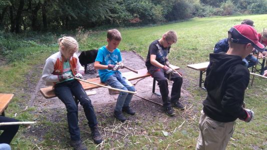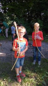 Nachdem die erste Hürde genommen war luden die recht milden, sommerlichen Temperaturen nun zum Quatschen, entspannen und zu Kaffee und Kuchen ein. Ab halb vier sollte damit jedoch erst einmal Schluss sein- zumindest für die Kinder. Jetzt hieß es: ran an die Arbeit! Angeleitet durch Gerda und Ulrich Hering vom Naturschutzzentrum Arche Noah aus Menden, konnten sich die Kids ab etwa 6 Jahren voll und ganz beim Schnitzen verausgaben. Alle interessierten Kinder durften sich mit Taschen-/ oder Schnitzmesser aus Ästen einen Pfeil und einen Bogen schnitzen. Schnell waren über 30 Kinder aktiv und konzentriert am Werkeln. Die kreativen Ergebnisse konnten sich durchaus sehen lassen. Einige Bögen wurden sogar mit Namen und Mustern verziert. Toll!