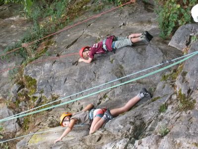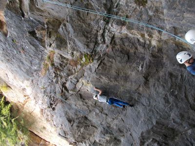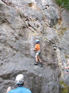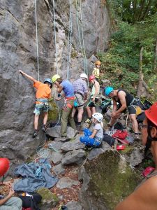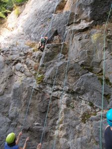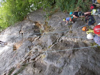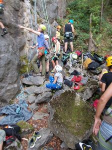 Nach einer Abenteuerfahrt durch den Steinbruch mit den PKWs erreichten wir nun endlich das Ziel. Alle Kinder und Erwachsenen erhielten das Klettergeschirr und Kletterschuhe. Im Anschluss wurden die Kletterregeln besprochen. Danach durften die Kids und die Erwachsenen sich an verschiedenen Kletterrouten versuchen. Es war schon für den einen oder anderen sehr anspruchsvoll.