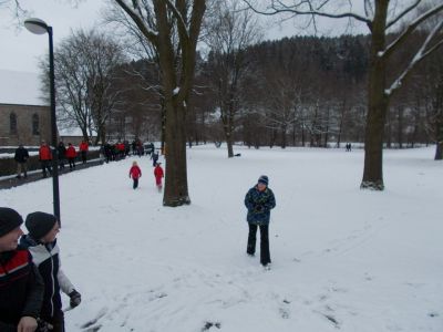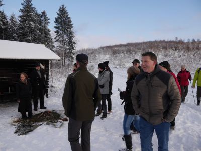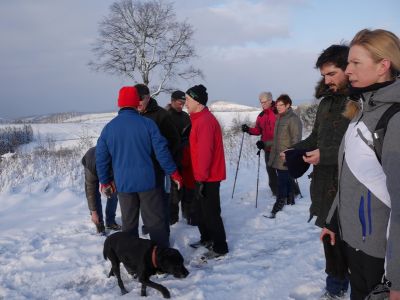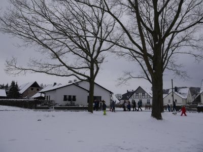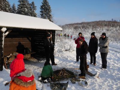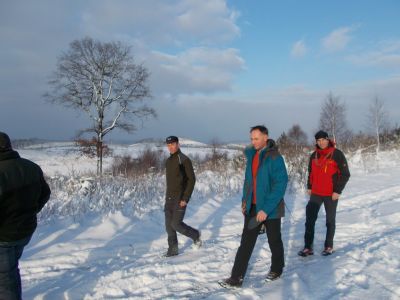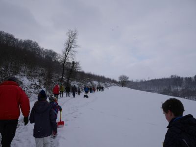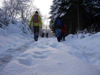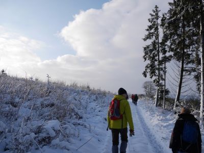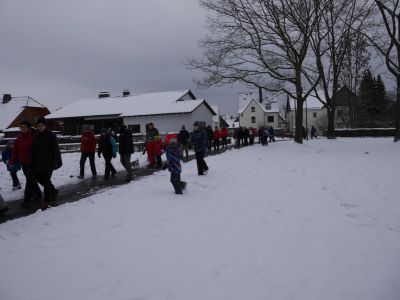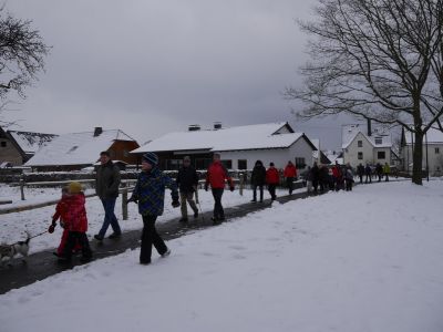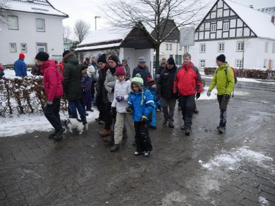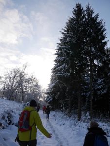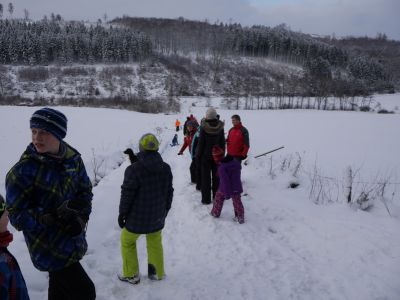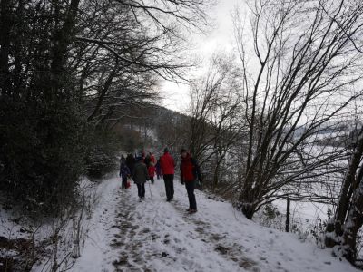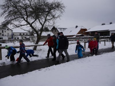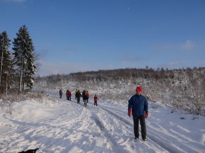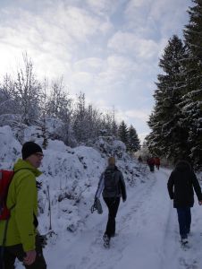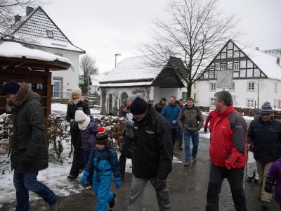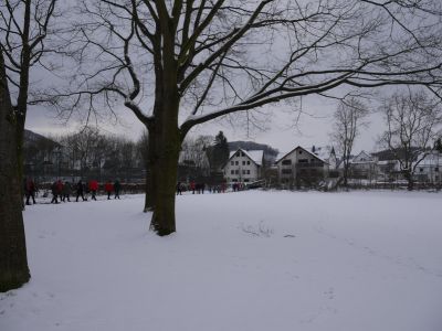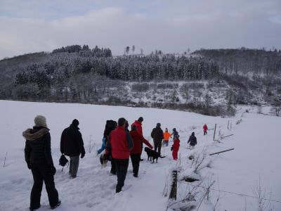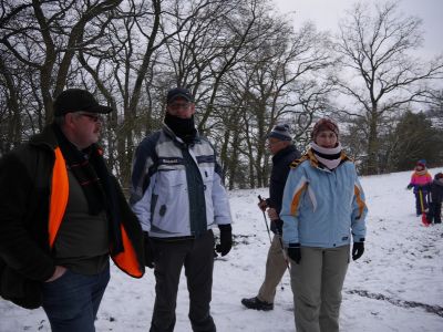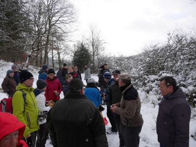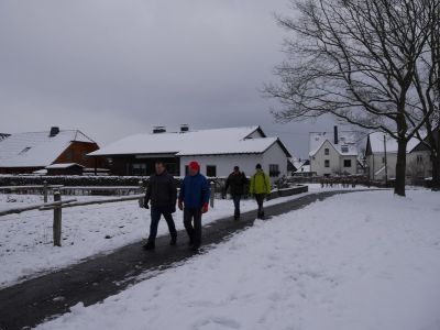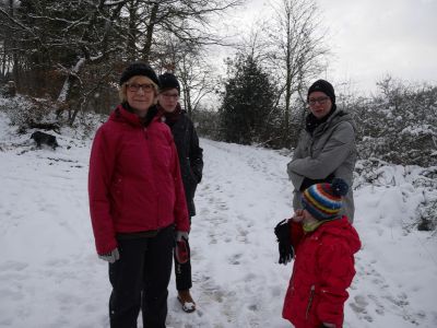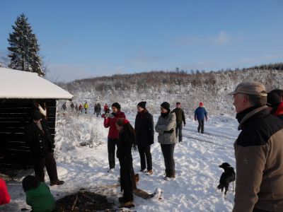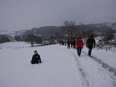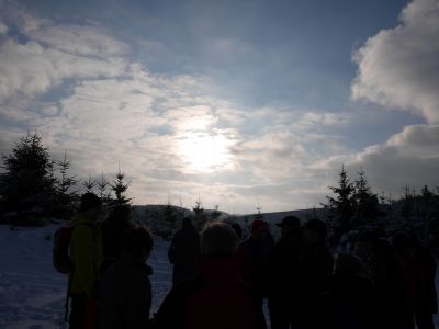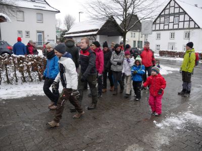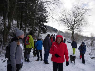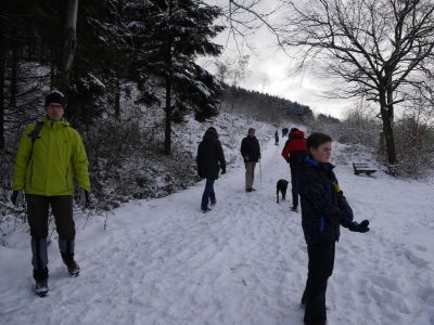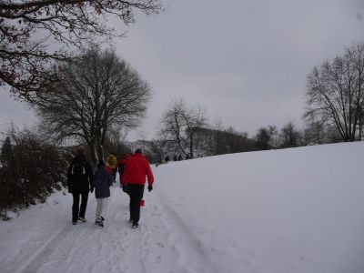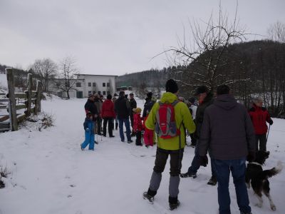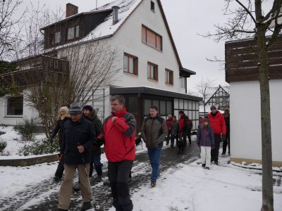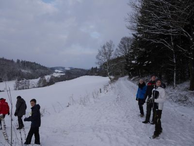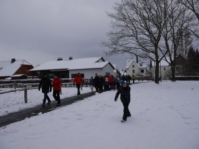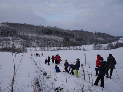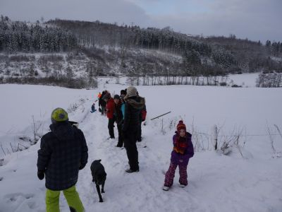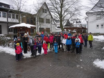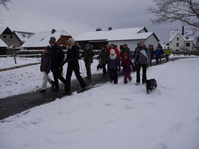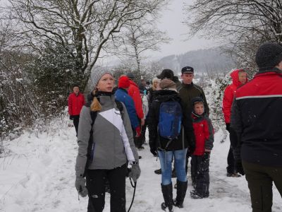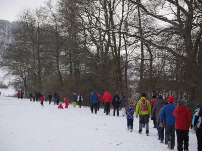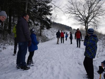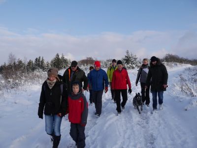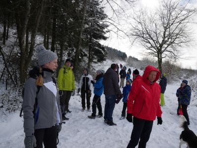 Der Winter hat sich in diesem Jahr viel Zeit gelassen. Nach schneefreien Weihnachtstagen hat es erst Anfang Januar „richtig“ Schnee gegeben. Bei eiskalten minus 2 Grad wunderbare Voraussetzungen für eine Winterwanderung, die ihren Namen auch verdient hat. Wie immer ging es um 14.00 Uhr am Marktplatz los. Nach dem obligatorischen Gruppenfoto machten sich zunächst alle über das Freizeitgelände auf den Weg zum Sportplatz. Jetzt wurde auch schon die erste Pause gemacht. Aber an langes „rumstehen“ war bei der Kälte gar nicht zu denken – da stieg einem direkt der Frost in die Knochen. Also schnell weiter Richtung „altem Bahnhof“. Auf halber Strecke hat sich dann die Gruppe geteilt. Der kürzere Weg führte hinterm Sportplatz direkt zur Biberhütte. Für alle die noch mehr die frische Luft genießen wollten, ging es weiter zum über den „Bahnhof“.